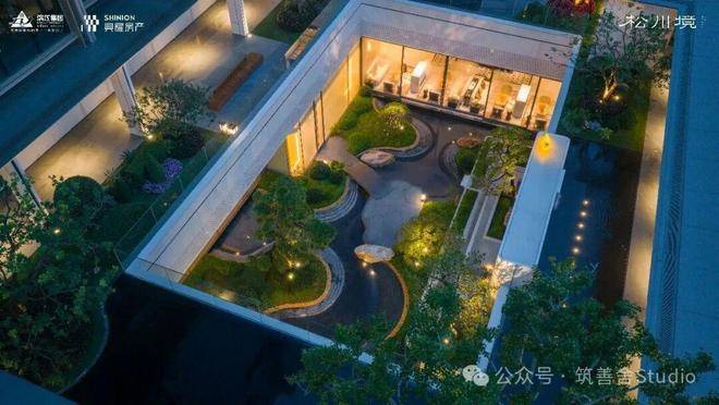 约3300平方米的中央景观,下沉式庭院与双水院景观错落有致,将《松阁观潮图》、《溪山行旅图》、《山亭文会图》三幅宋代古画,巧妙融入松川境的立体山水之中。高层与排屋区之间,一条长约210米的中轴景观横贯东西,串联起「松川十一境」的雅致画卷。该项目景观设计由北京顺景园林执笔。