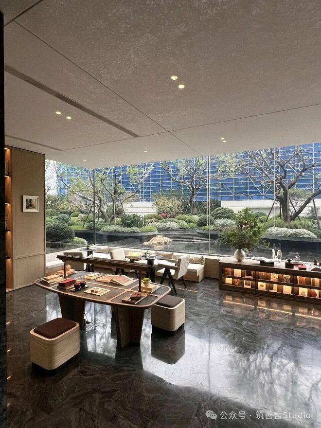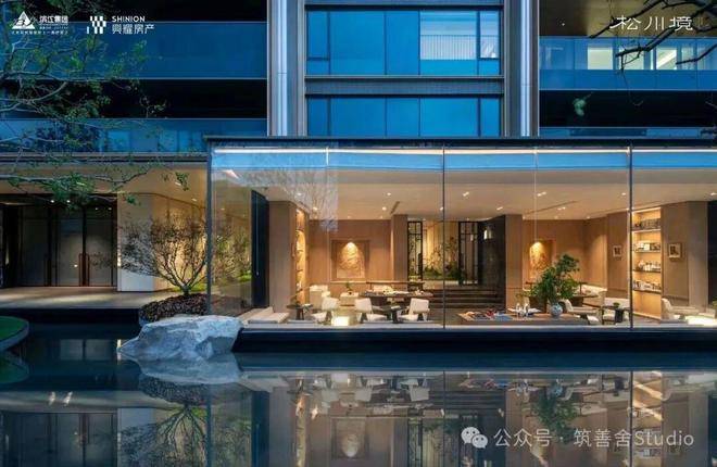会所庭院以建筑为框,引泉植松,奢造约7米高溪山流瀑,特选6棵造型黑松。将二维的《溪山行旅图》转译为一幅“幽深与静谧、壮丽与宁静”的立体山水画卷。