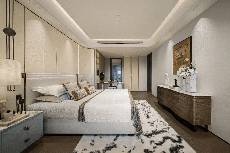 项目还融合了五星级酒店的精工标准,金属踢脚线、无主灯系统、防溢卫浴等,每一处细节都彰显着品质与格调。这种品质,不是通过堆砌豪华材料实现的,而是渗透在空间的每一个细节里。
