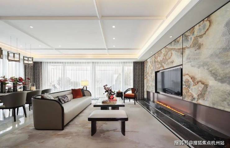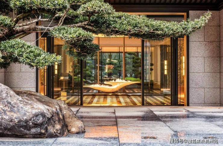 礼序中庭 山水观心府门承袭中式府邸的传统对称性布局,再现温润如玉的礼序空间,温润优雅 艺术行旅以黑白色为主基调,陈设杭州非遗铜刻,串联龙坞茶园美景,带来非凡艺术盛宴