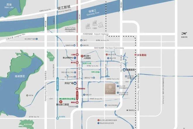 紧邻风情快速路、通城高架,地铁环绕;周边有银泰、开元等商业体,以及萧山中学等教育资源