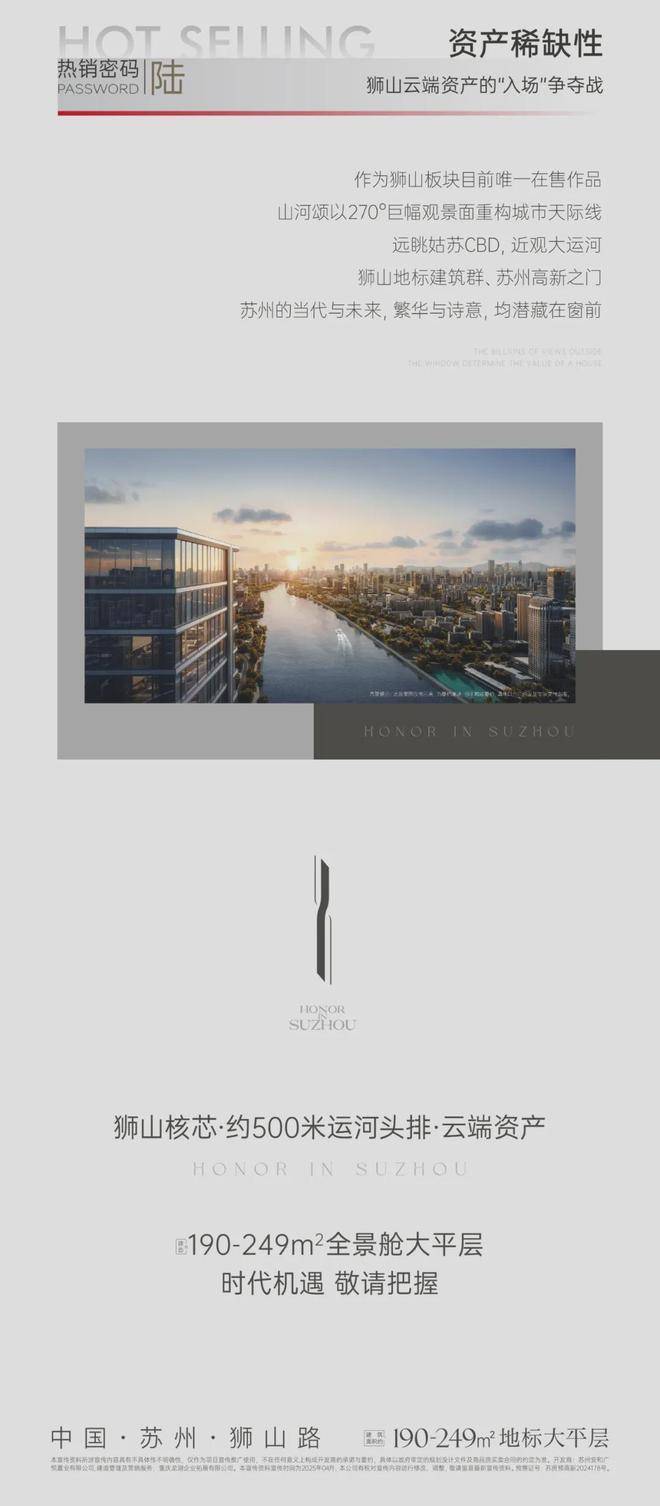 苏州唯一190㎡ 以上高端大平层,圈层纯粹项目面积段190㎡ 起步,面积段190-380㎡ ,面向苏州高净值人群的地标资产,真正的狮山路极核,运河头排大宅!