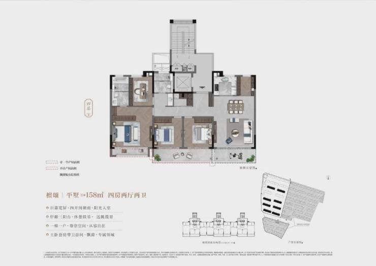④建面约158㎡平墅,4房2厅2卫:一梯一户, 动静分区。南向3房,均带飘窗。北房间少承重墙,可改造为豪华主卧,南侧观景阳台+北侧双露台。