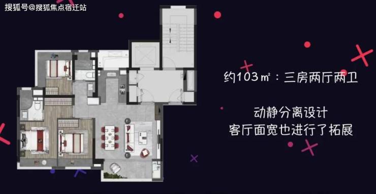 103平的3房2卫户型,增加一个卫生间,同时客厅面宽也进行了拓展。