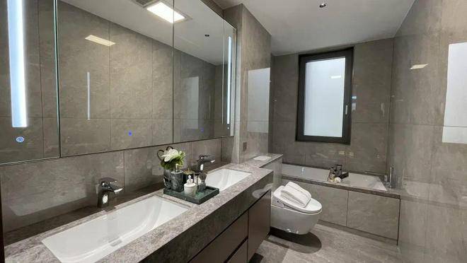 线品牌,卫浴配置科鲁迪龙头、唯宝壁挂式智能马桶,细节彰显高端定位。