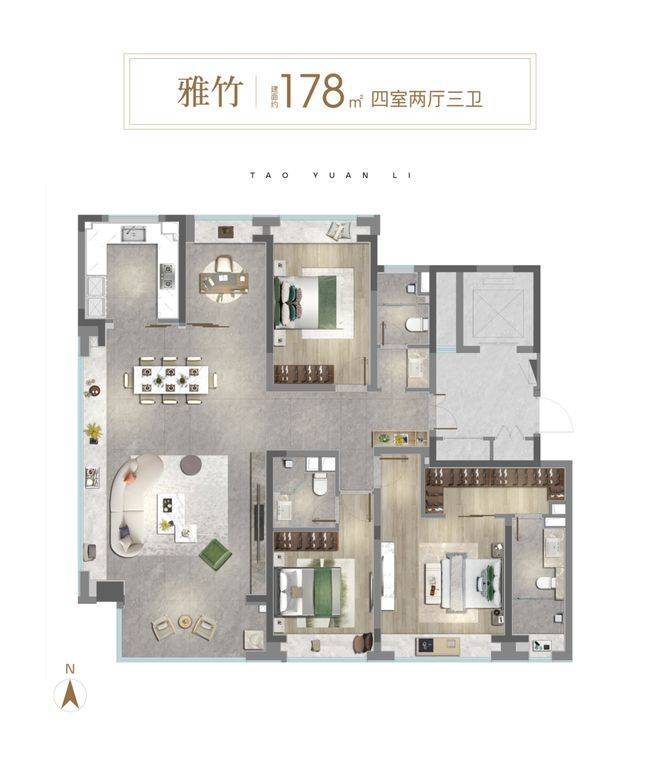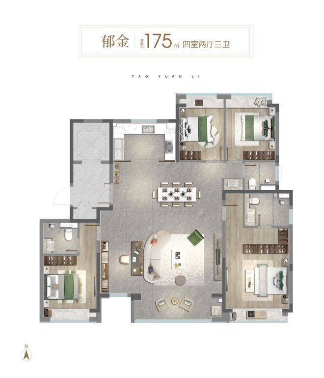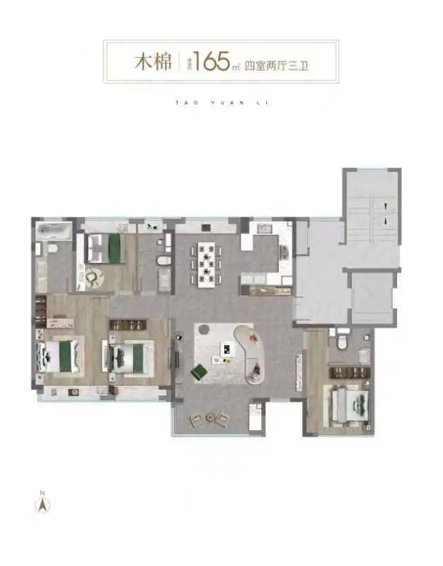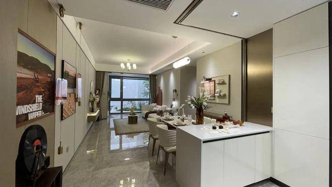 建筑面积约165㎡户型样板间,打造南向4.5开间,即在4开间的基础上,通过设计手法将餐厅、客厅、厨房、阳台融为一体,让传统竖厅的通透格局同时具备横厅的宽广空间。