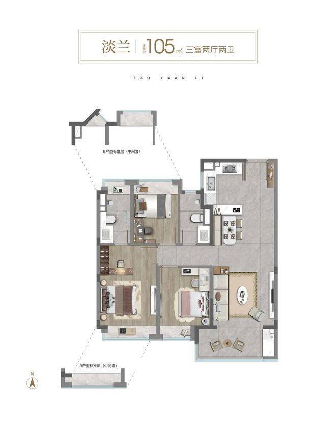 户型设计方面,105㎡样板间打造标准的三开间朝南设计,加之约3.1米的层高配置,整体居住体验明亮开阔。
