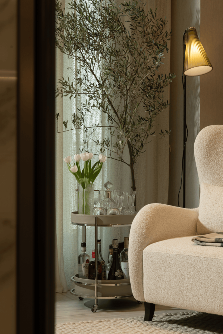 约9米净高的门廊尺度顶部挑高,南北向礼序轴与东西向精致生活轴交织形成十字转场,整个归家礼仪,在这里升华至顶点。