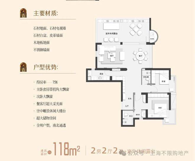 118㎡2房2厅2卫+25㎡室外休闲露台 东北 850万