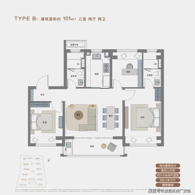 建面约101㎡B1户型尺度感惊人,约5.2米南向面宽的客餐厅以及阳台,为室内带来了非常出色的采光度。