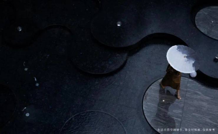 高层区呈现浮岛美学园林,归家即度假:以“浮岛”为核心理念,通过“林岛漫步—循水归岸—闲庭雅致”的动线设计,构建起层层递进的归家仪式感。园林内部“叠水—镜面—汀步”的立体水网,与外部公园水系相互呼应;连廊串联起架空层与景观节点,让自然与生活实现无界交融。
