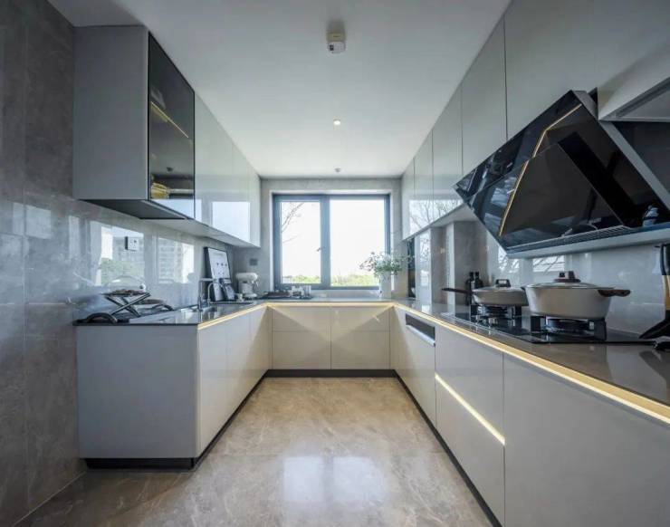 将传统直墙做成S型 ,错落出额外的凹槽空间,这个S墙可以作为冰箱或柜体的安置点,释放更多的厨房空间,空间更加简洁美观。