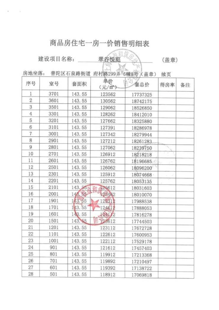 上期一房一价表如下: