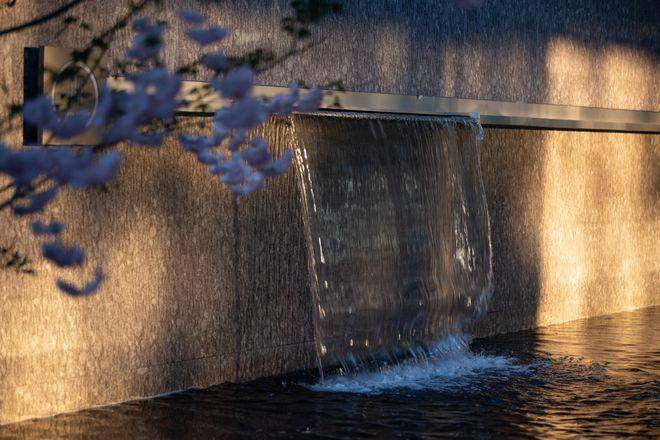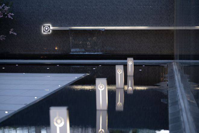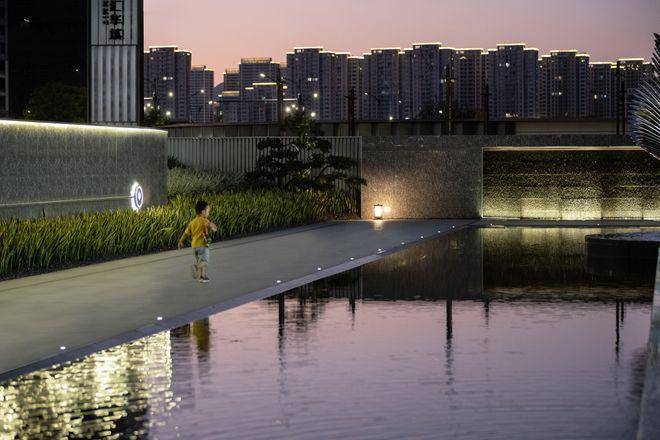 水面凸起的条形水台,线状排布了欢快的涌泉,以动衬静;引向精细雕琢的艺术品“鲲鹏之翼”,视线便随之追向了城市的边际,万家灯火,山脉绵延。