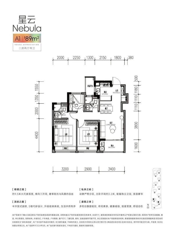 带 独立玄关收纳 , 南边套房主卧带走入式衣帽间+独立卫浴+飘窗 , 南向约6.4米面宽,带阳台,U型厨房带大开窗,餐客厅一体带约5.8米超长飘窗 ……该户型更具有生命力。