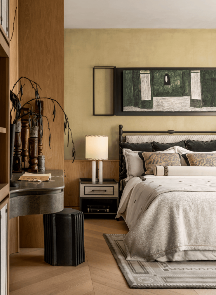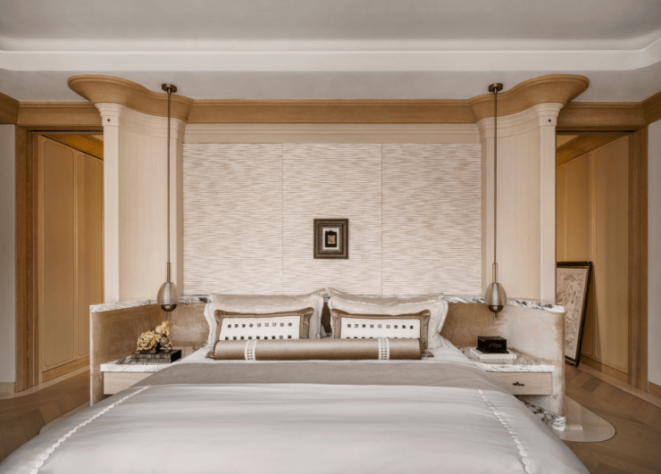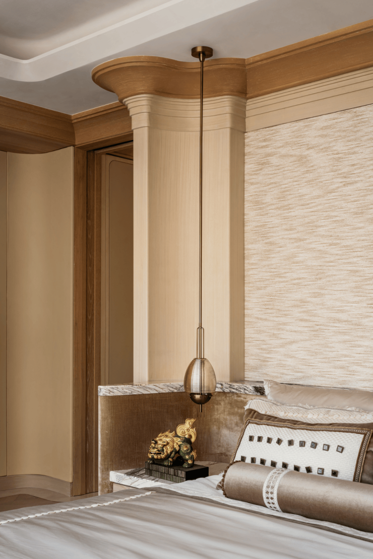 主卧室空间彻底告别了客厅厨房等公共空间的视觉感受,转而相背疾驰,虽然继续顺着同样的艺术风格,但却融入了更多适合睡眠和冥想的空间色彩陈设。