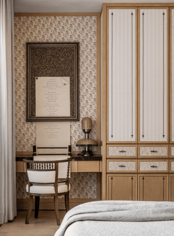 次卧大胆地在装饰层面上引入春天,仿佛走入玛格丽特的油画,在后现代艺术思潮的影响下,将更多对复古和装饰主义的理解,犹如彩蛋埋藏于软装家具中。