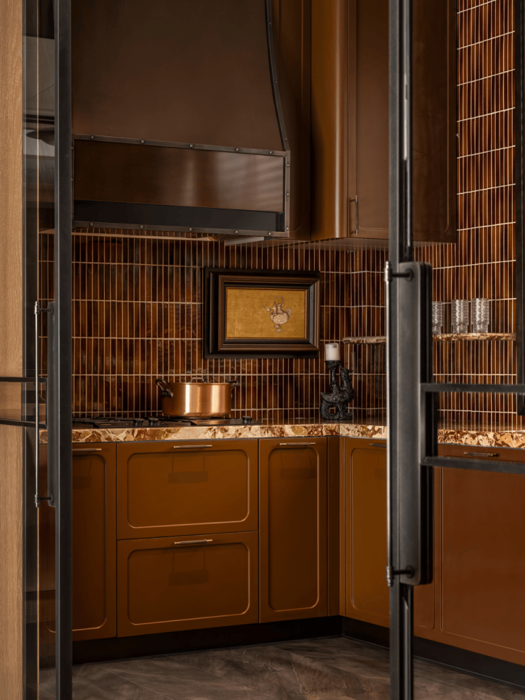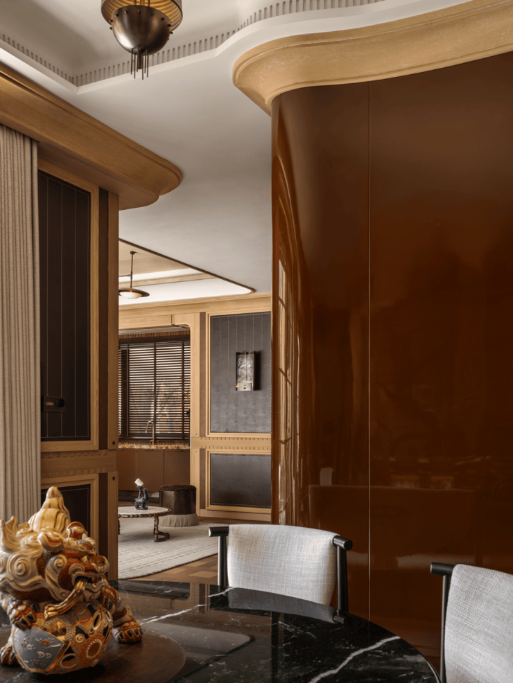 餐厅延续经典装饰艺术美学,以深绿色奢石餐桌、珠光椅面与手工金属吊灯营造低调而华丽的用餐氛围。从餐厅步入家庭室,将自然优雅与文化深沉融为一体,空间在静谧中流露复古气息。桐安里售楼处电话:400-9016-520⭐⭐