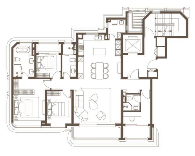 其他空间通过经典十字序列厅有机组织:南侧双套房,均有南向阳台。主卧套房升级对标行政套房,衣帽间串联五件套卫浴空间,纵享奢华体验。