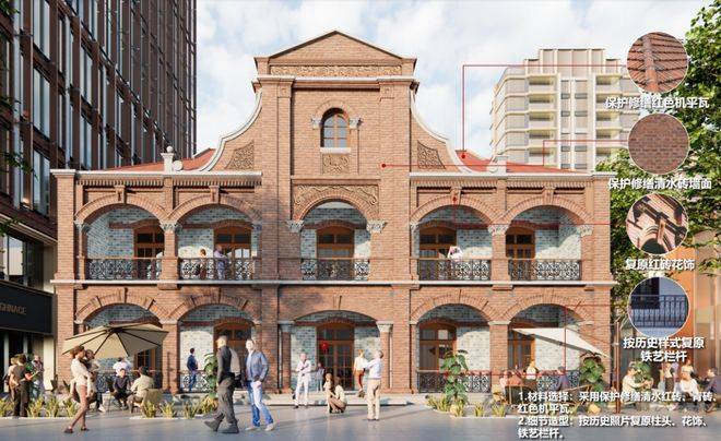 功能之上,中信泰富自然也不会放弃社区风格上的打造。南侧主入口一侧为文物保护点,通过精心修缮,从清水砖墙面到红砖花饰,每一处细节都按照历史照片对比复原,延续海派气质,彰显当代活力。