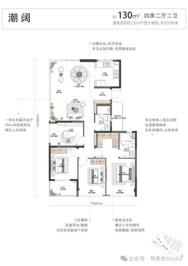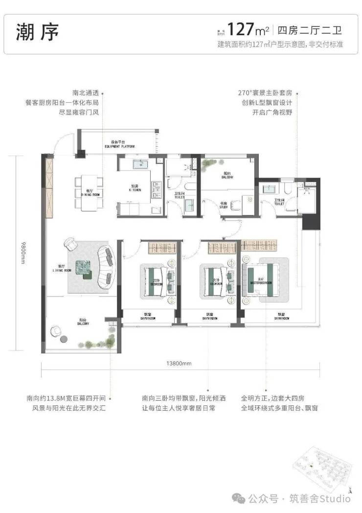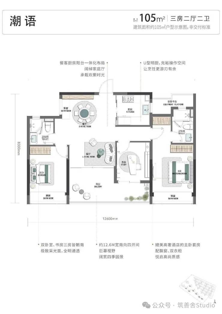 项目占地约6.4万平方米,地上建面约9万平方米,地下建面约5.7万平方米。潮映杭园凭借约1.4的低容积率,在金沙湖CBD核心区域精心规划了多元产品业态,涵盖约105-130平方米小高层、约139平方米洋房及约255-330平方米排屋,满足不同家庭的居住需求。首开7# 户型建面约105-127-130方。