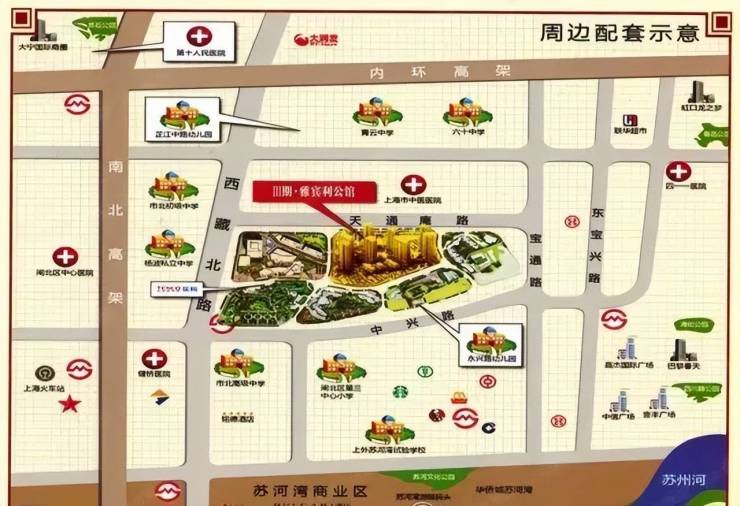 项目距离人民广场约2.5公里,离苏河湾仅1公里,项目周边环伺南京路商圈、陆家嘴商圈、静安寺商圈、苏河湾商圈、四川北路商圈、大宁商圈等多个市级商圈,居住氛围成熟。