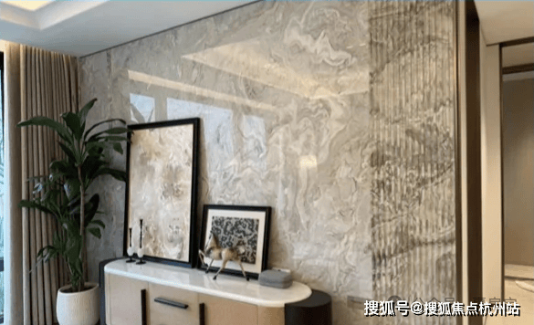 客餐厅空间高标准交付,其中: 电视背景墙采用安第斯雪景仿奢石大块岩板 (融创外滩壹号院4000万+豪宅同款)+褶皱石材包边;