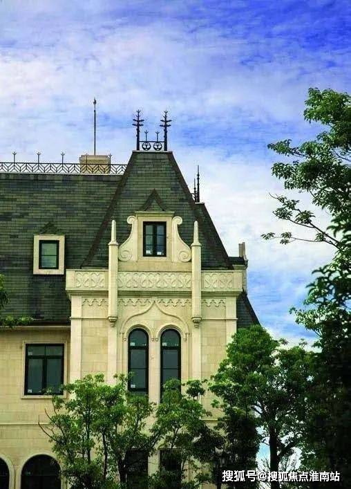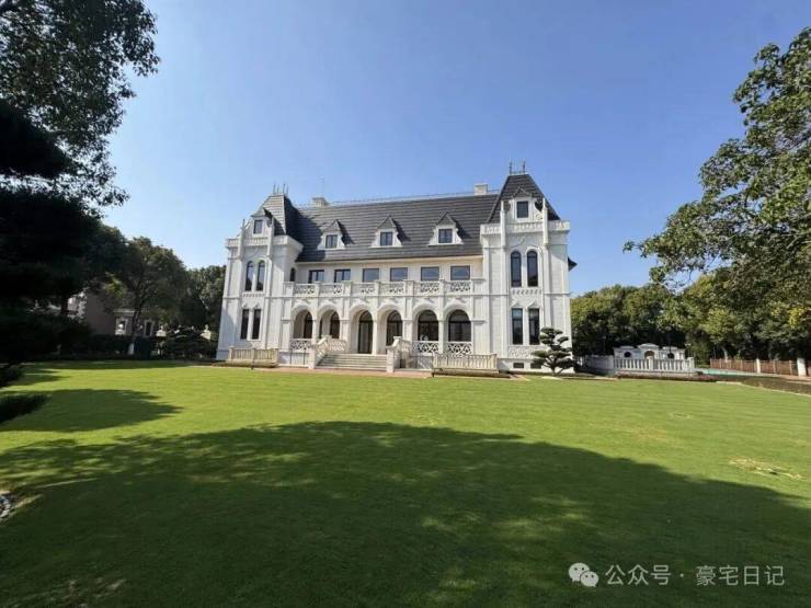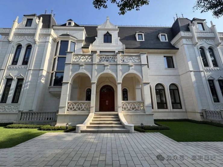 浅米白石材立面,搭配深灰坡屋顶,经典的老虎窗与雕花栏杆,复刻着法国贵族的仪式感。