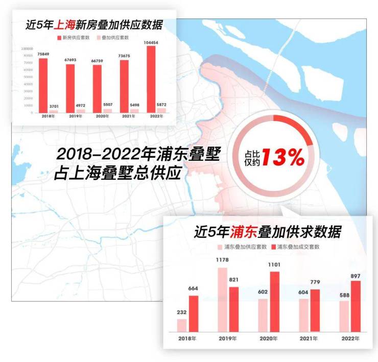 其次,浦东叠墅更少,2018-2022年浦东叠墅供应仅占上海叠墅总供应的约13%。