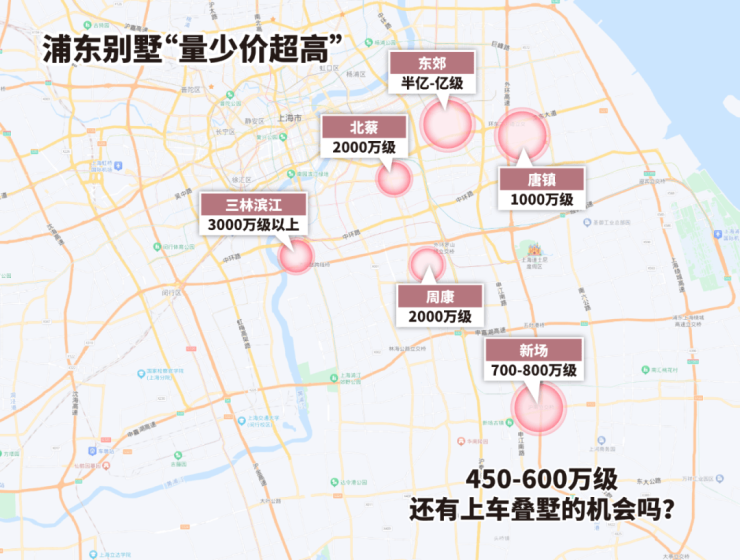 小胖君标注了近两年浦东有别墅供应的区域,外环内基本2000万起步,唐镇1000万级,甚至你买到新场都要700-800万级。
