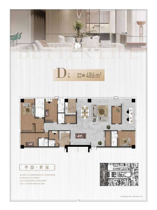 户型特色:全景落地窗(客厅面宽6.6米)、270°环幕视野、10㎡+外景阳台、双套间设计及中西双厨;486㎡户型含300㎡私享花园露台。25