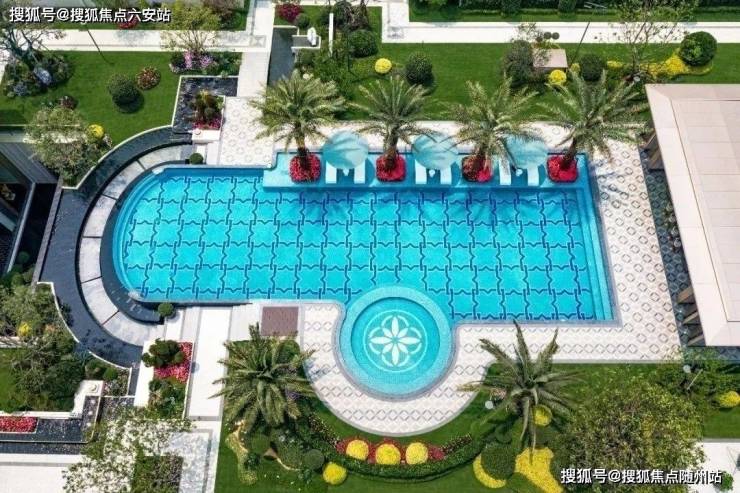 项目采用“一轴两带六大典藏”景观布局,以约280㎡无界泳池和约1000㎡中央草坪为核心中轴。泳池周边铺设多色砖环,融合海派度假风格与都市精致感。
