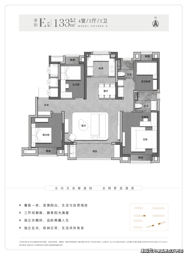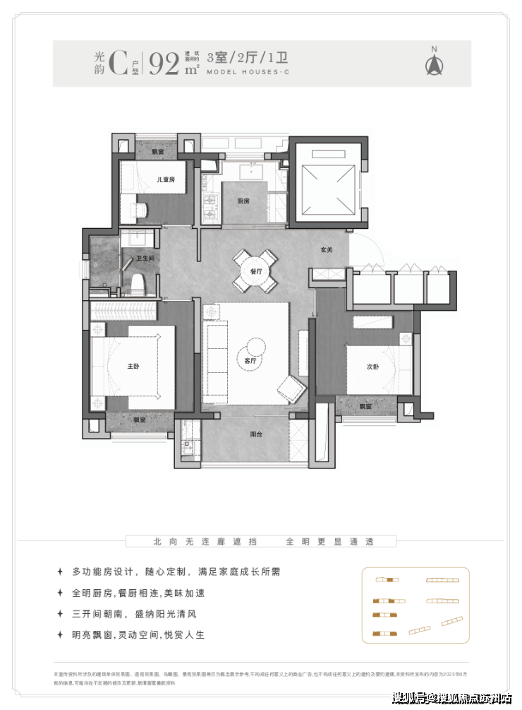 另外这个户型能更好实现南北通透,客厅-餐厅-阳台-厨房一线连通。
