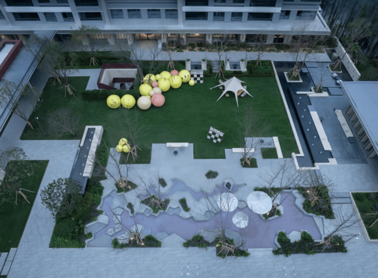 内部生活场景及配套也非常丰富:阳光草坪,搭个天幕就能露营;心爱的“毛孩子”也有了玩耍的去处;边上还有小朋友的戏水池,挽起裤腿就能踩水玩。