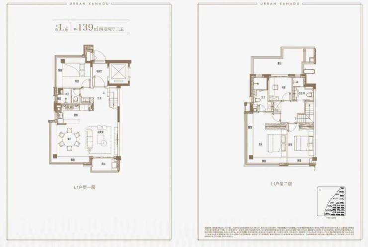 建面约139㎡上叠户型,三层是会客区,四层是居住区,阳台+露台+多个飘窗设计,附加空间非常大,在别墅类产品中实属罕见!