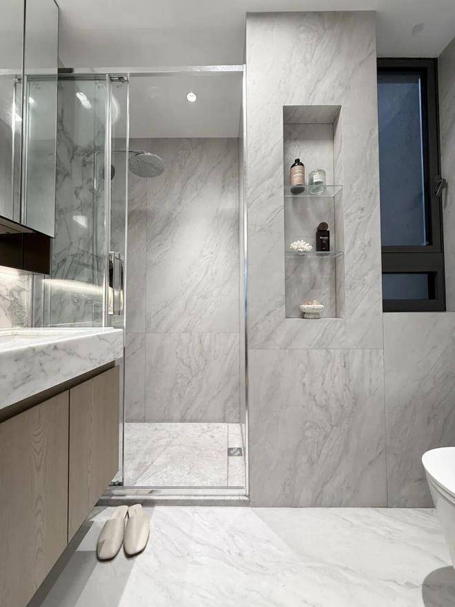 全屋台面、地面、墙面采用大面积的岩板,其中,客餐厅地面采用900*1800大幅岩板拼接而成,无缝、好打理、高颜值。