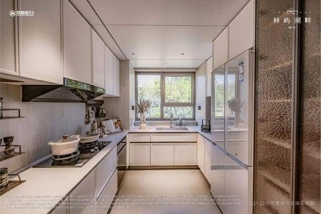 LDK一体化巨厅,U型厨房布局,大气操作台台面,预留好了双开门冰箱和餐边柜位置,实用性拉满。