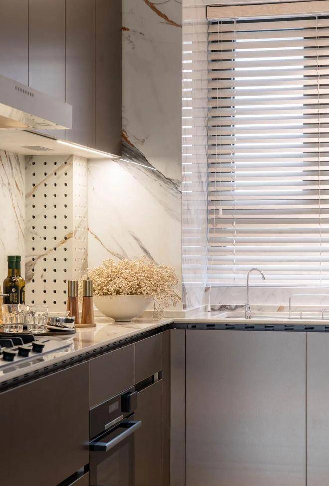 厨房空间荟萃了伦敦海德公园一号标配的嘉格纳油烟机与燃气灶,搭配迪拜帆船酒店同款博世BOSCH冰箱,辅以全球奢品级厨房品牌骊住LIXIL水槽。