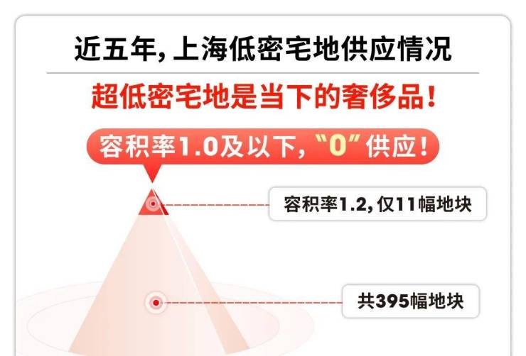 近五年,上海共出让395块宅地,其中,容积率在约1.2以下可以用作开发低密宅地仅有11副。而容积率1.0及以下可以用作开发纯墅区的地块,供应为“零”!