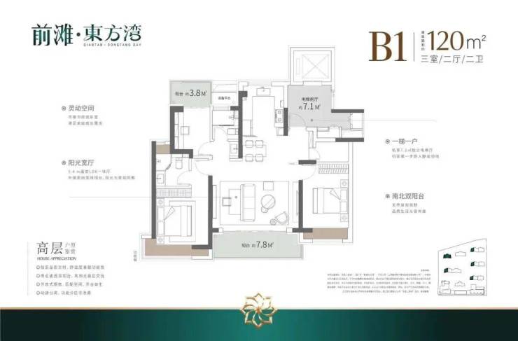 独立电梯厅是项目标配,仅建面约103㎡户型2梯2户,其余户型全部1梯1户,全系带(类)独立电梯厅,这妥妥的就是豪宅的配置!