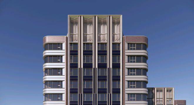 外立面采用Art Deco风格,珍珠蓝铝板+香槟金线条+摩登红元素,顶部钻石切面玻璃幕墙,270°弧形阳台可瞰陆家嘴天际线。