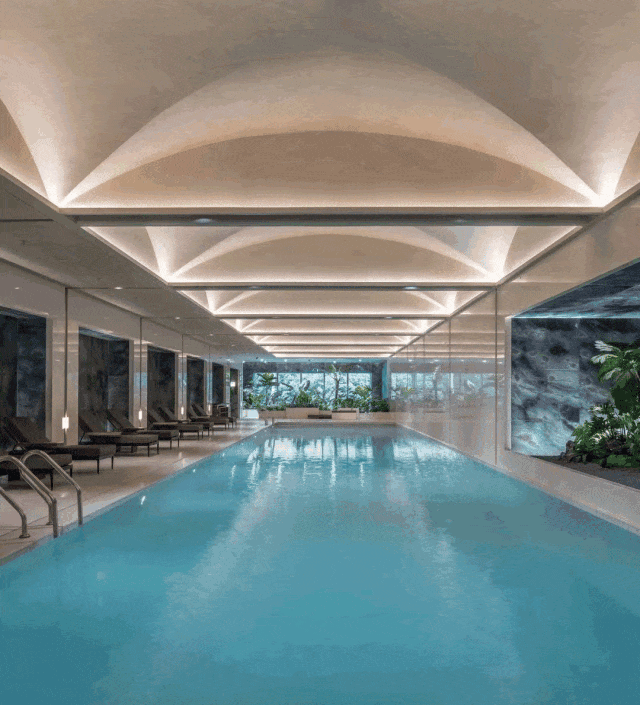 高端会所:1500㎡下沉式会所,配置植物园恒温泳池、女性友好健身房(专属器材+营养顾问)、恒温酒廊及私宴厨房。