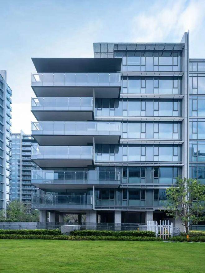 建筑设计由line+建筑事务所联合创始人孟凡浩执笔,进口石材干挂、三层中空Low-e超白玻搭配凤铝科技阿克苏氟碳粉三涂工艺铝板的外立面,晴天里像被阳光吻过的蓝宝石,纤长轮廓在蓝天下格外明快,让人不由得想起纽约ONE57。