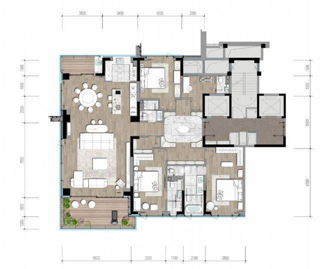 建面约160㎡户型,把“实用”玩出“奢感”,两梯两户,三室配了三卫,居中的一体化餐客厅超懂生活,几乎所有空间都利用到了实处。