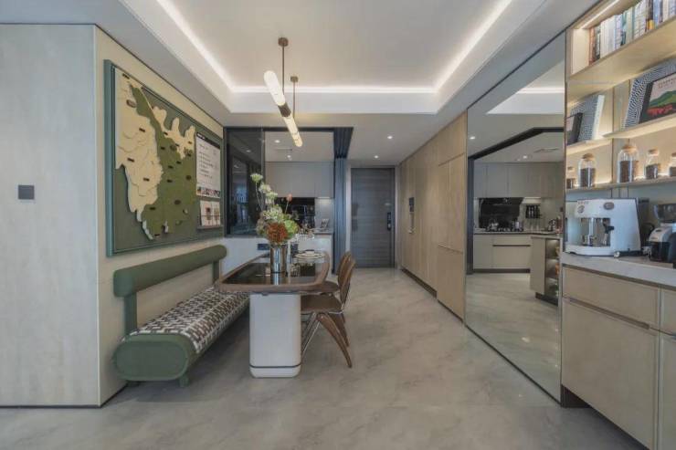 这处门庭采用贝金米黄石材、维多利亚绿、白雪公主奢石,结合古铜色金属板,形成冷暖撞色的张力美学,打开了城市奢度,每个细节透露出“贵”。