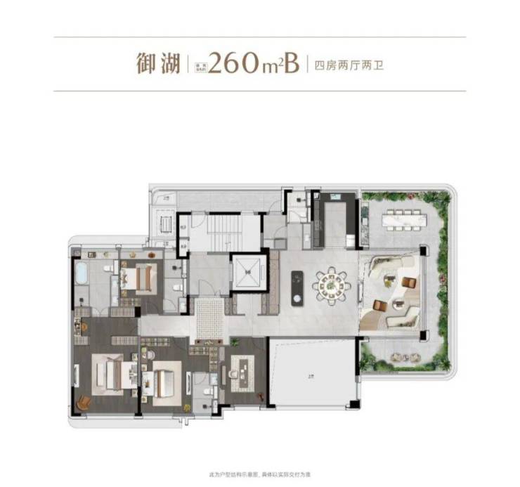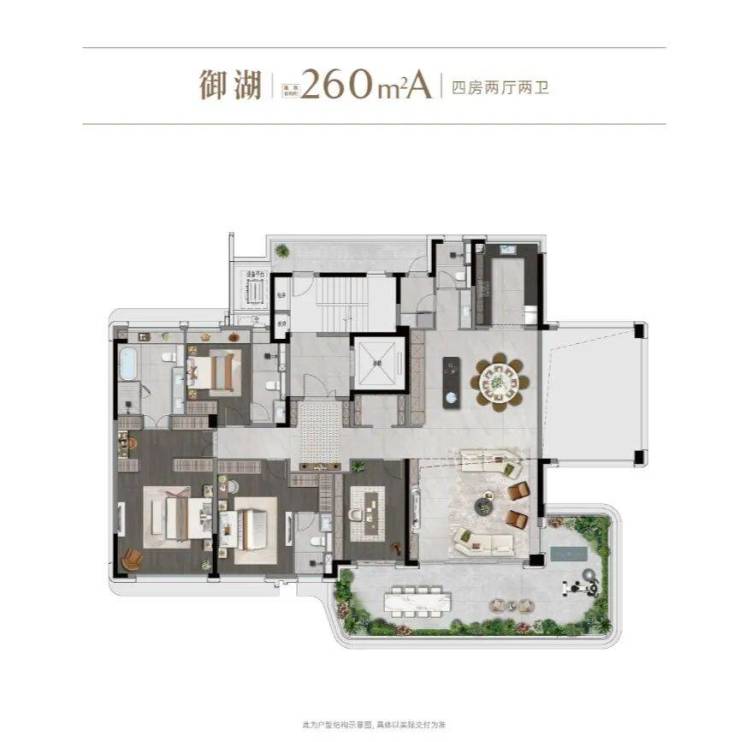 建面约260㎡观湖大宅实现一层一户、最大约23.8米南向大开间,光主卧就有4.5米,带超大空中庭院和开间超10米的LDKB,北面也有开间7.3米的大阳台。