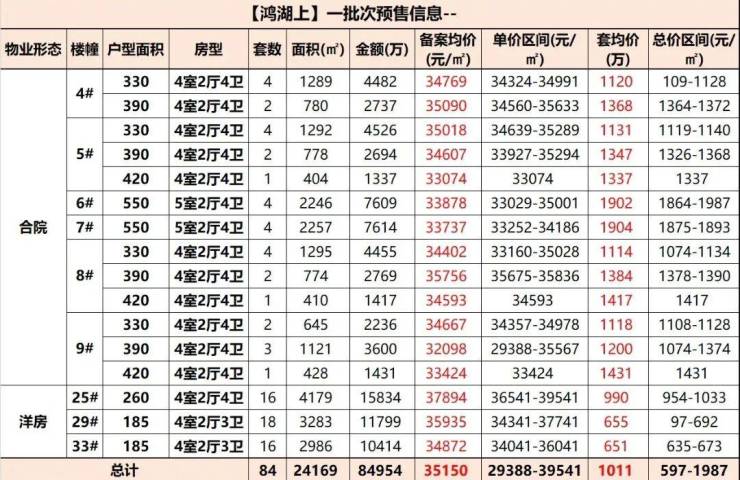 整体备案均价约35150元/m²,单价约29387.54-39541元/㎡, 洋房总价597w-1032w,合院总价1074w-1987w,洋房精装,合院毛坯交付。