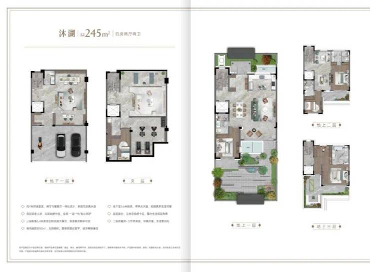 面积段为建面约245/287/295/365m²四大户型,依户型不同,巧设三面围院和南北分院两种格局,地面三层+地下两层的垂直动线,实现了完美的功能分区: