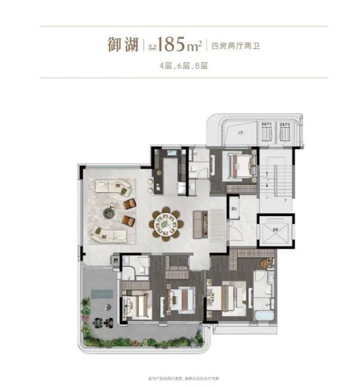 同时,不管是260㎡的洋房大平层,还是接下来这个185㎡的墅厅,不同位置的露台,设置不同的场景感。