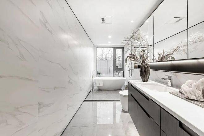 同时,我们巧妙运用“竖条分段式设计”。如厨房移门,衣帽间玻璃门的长虹玻璃,纹理飞流倾泄,灵动且富层次;电视背景墙的极简竖条形制,卫生间的三段式处理,尽显立体艺术感。包括一些特别考验工艺难度的收口、线条等,都从细微处流露巧思。